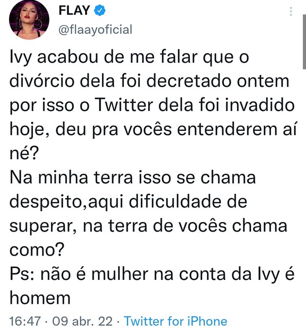 Em seguida, Ivy afirmou que seu Twitter e seu WhatsApp foram hackeados e esclareceu que esse caso que teve áudios vazados aconteceu 4 anos atrás. “Nó, e tão de marcação comigo, hein? Não sei se vocês lembram que semana passada eu falei aqui que meu WhatsApp também foi hackeado. Só pra esclarecer, essas conversas que tão circulando aqui não são de agora, são APENAS de 4 anos atrás, então tem bastante tempo. É alguém que já tinha isso salvo no telefone e agora quis expor uma situação de apenas 4 anos atrás”, disse.