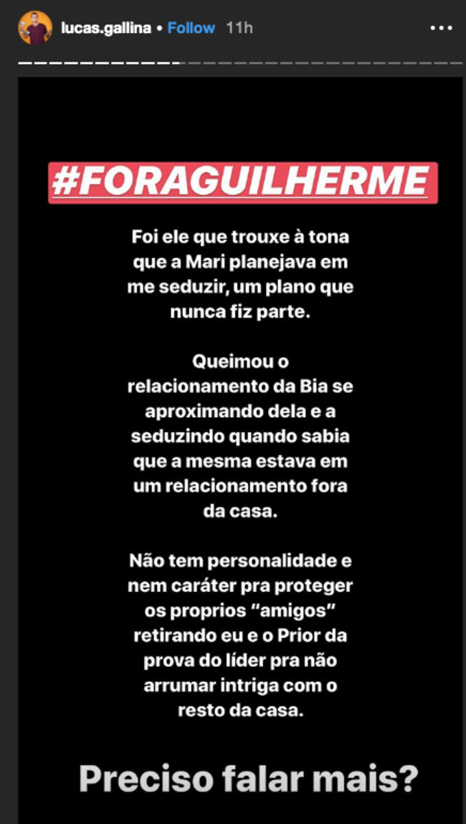 Nos estories, Lucas escreveu que Guilherme foi quem trouxe à tona o ‘teste de fidelidade’, onde os ex-participantes do reality teriam combinado em seduzir as influenciadoras Mari Gonzalez e Bianca Andrade para prejudicar o relacionamento das sisters fora da casa. Além disso, o ex-brother relembrou o momento em que Gui vetou os amigos Prior e o próprio Lucas da prova do líder.
