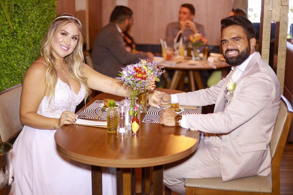 Os dois esperam o fim da pandemia para fazer a cerimônia com mais convidados: "A gente reuniu as famílias e os amigos muito próximos mesmo, meus e do Lucas, então foi uma coisa bem intimista, com as mesas bem separadas. Máscara, álcool em gel, distanciamento... e foi lindo, maravilhoso. Agora sou uma mulher casada!".