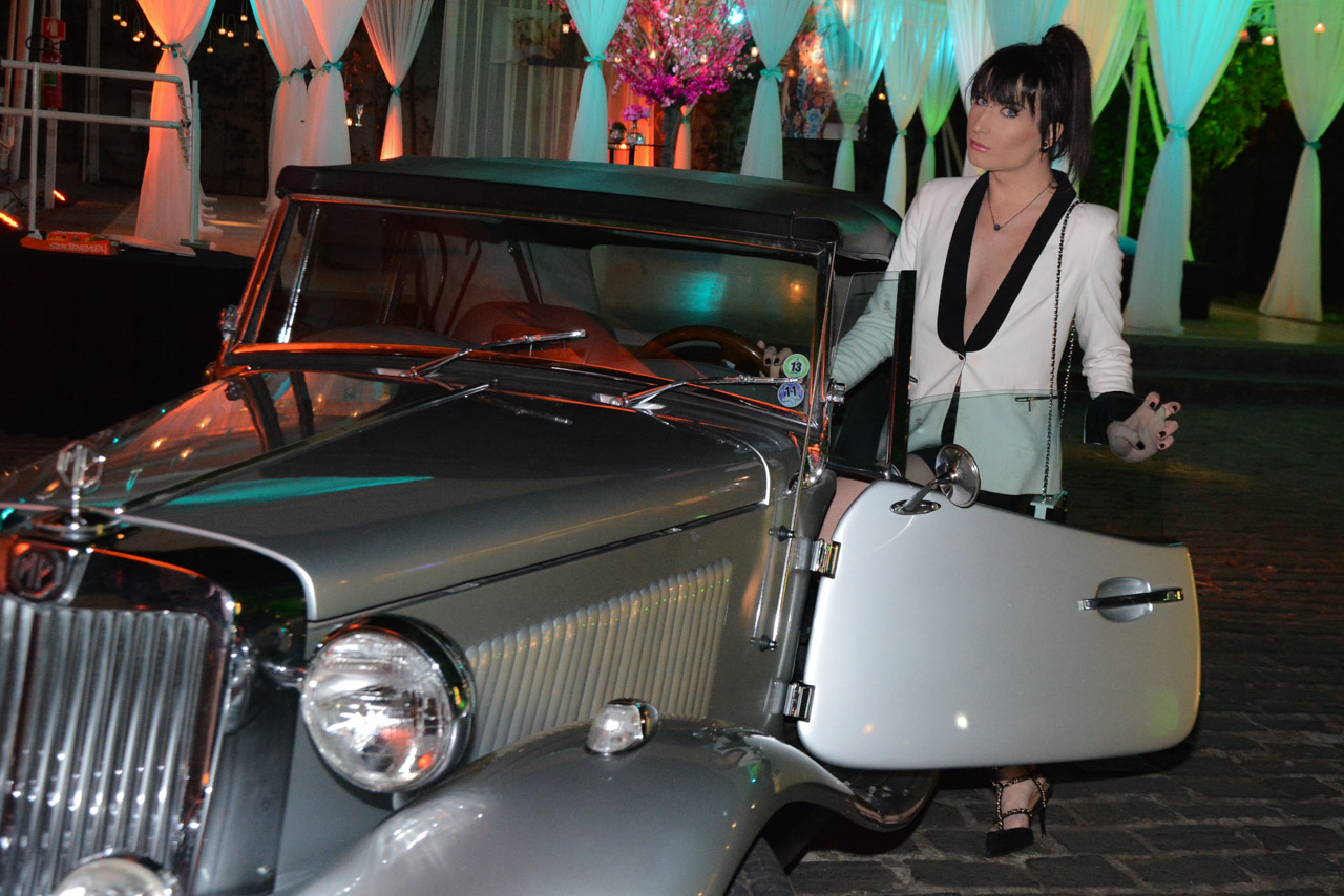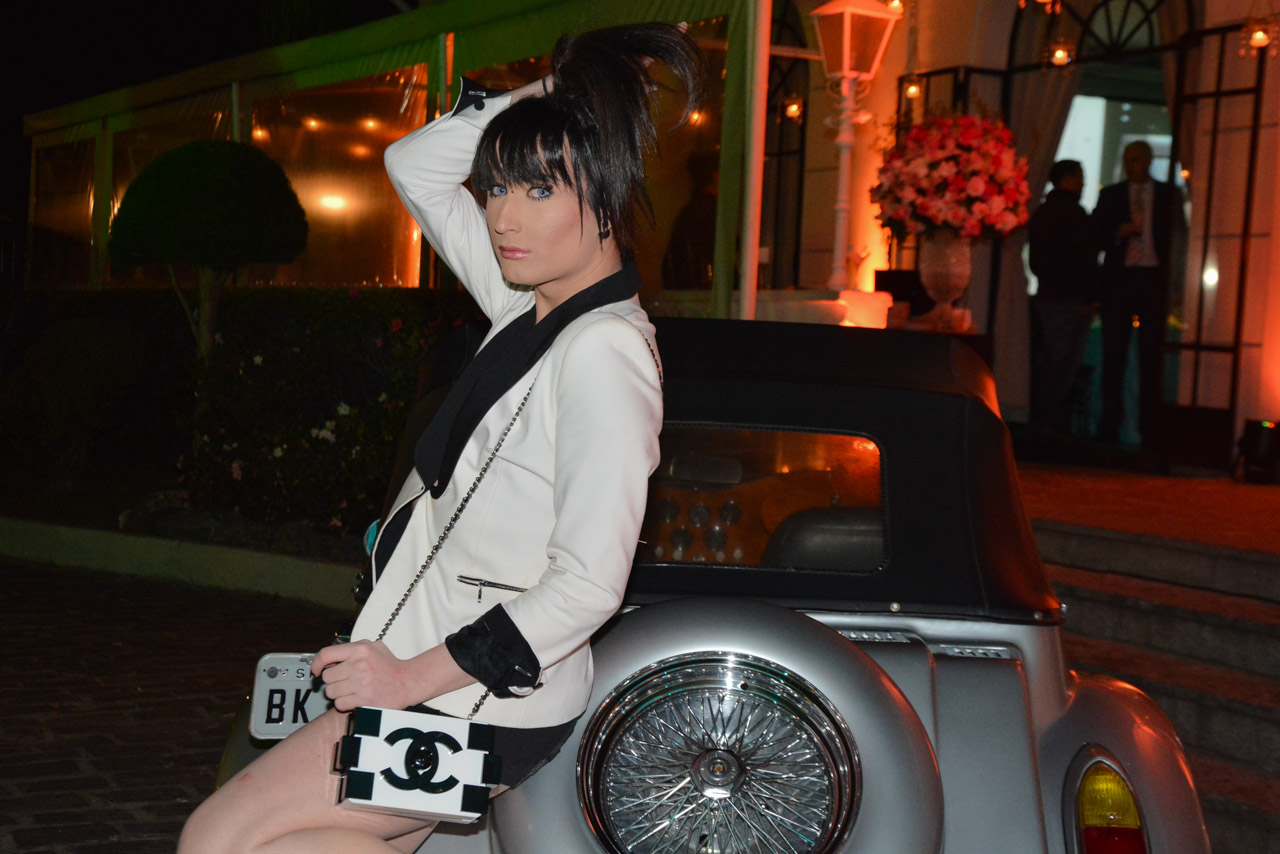 O rapaz chegou em um carro vintage de luxo e surgiu com um terninho super decotado, mini-saia colada e salto alto.