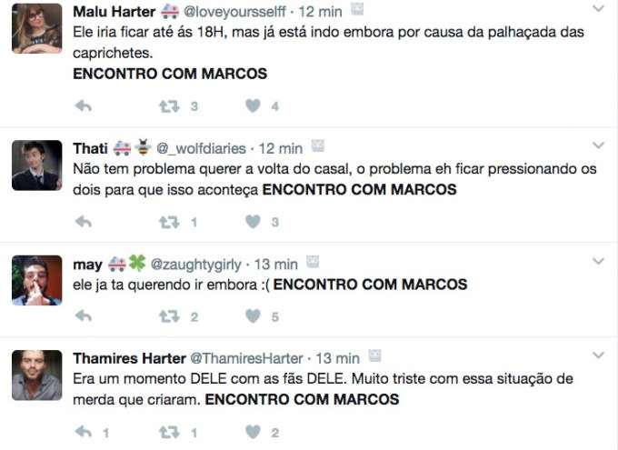 Com a hashtag “Encontro com Marcos” também teve gente insistindo no encontro entre ele e Emilly. “Marcos ja foi pq marcou encontro com a picinho [apelido de Emilly] ENCONTRO COM MARCOS so não ver quem não quer”, apostou uma seguidora.