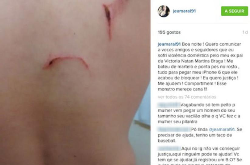 "Quero comunicar que eu sofri violência doméstica pelo meu ex, pai da Victoria. Me bateu de martelo e ponta pés no rosto, tudo para pegar meu celular, que ele acabou de bloquear! Eu quero justiça!", escreveu em sua rede social.