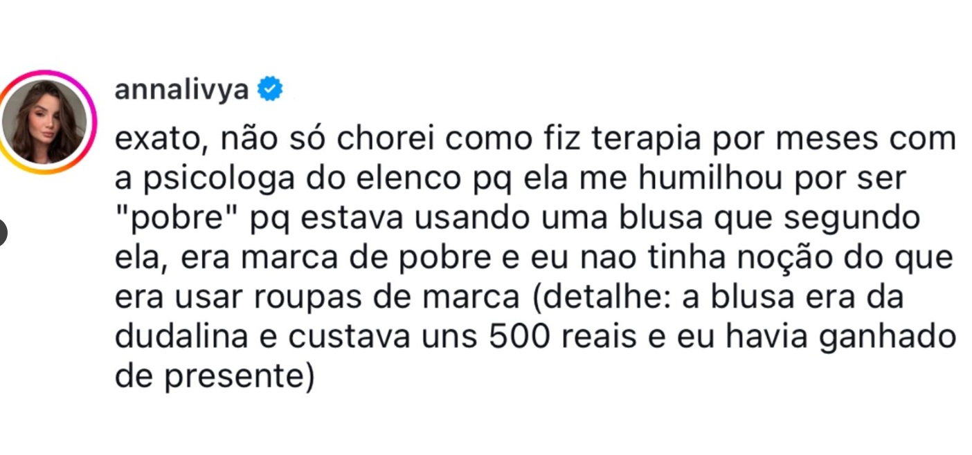 A atriz Anna Livya, que também participou da trama, apoiou o depoimento de Gabriella e contou ter sido humilhada por Júlia por usar uma blusa que teria sido classificada por ela como “de pobre”. "Aquilo me marcou. Chorei muito e precisei fazer terapia por meses", revelou Anna em um comentário na internet.