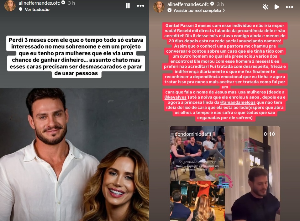 "Passei 3 meses com esse indivíduo e não iria expor nada. Recebi mil directs falando da procedência dele e não acreditei. Dia 8 desse mês estava comigo ainda e menos de 20 dias depois está na rede social anunciando namoro. Assim que o conheci, uma pastora me chamou pra conversar e contou sobre um caso que ele tinha tido com outro homem no qual presenciou vários dos encontros. Ele morou com esse homem 2 meses. Eu preferi não acreditar", começou Aline.