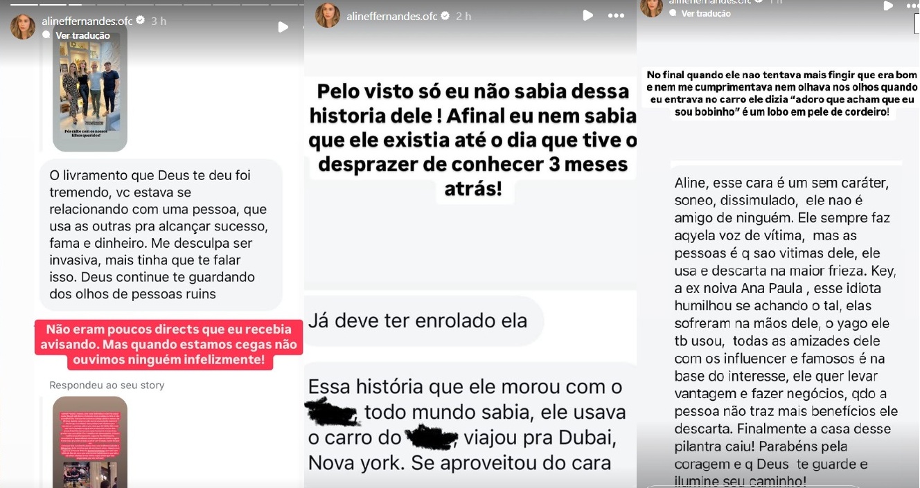 Aline ainda publicou vários prints de mensagens que recebeu no direct do Instagram sobre Gustavo, que ficou conhecido ao participar do BBB23 e namorar a jogadora de vôlei Key Alves.