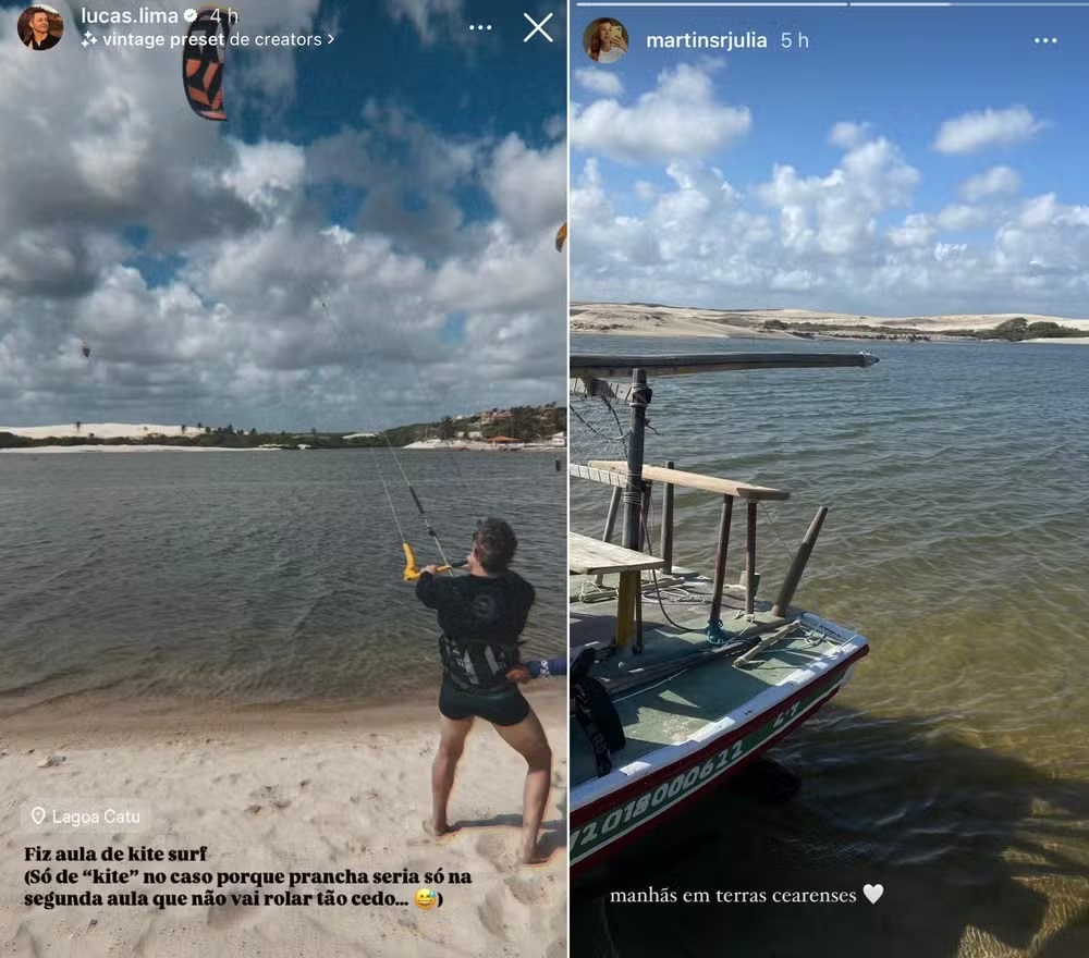 Lucas postou fotos praticando kite surfe, enquanto ela publicou imagens no mesmo local e posou com colegas de equipe, sem mencionar Lucas.