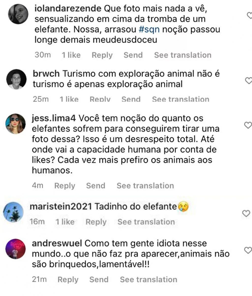 A ex-bailarina do Domingão apareceu sensualizando de biquíni em cima da cabeça do elefante, o que não pegou nada bem pela questão de maus tratos ao animal.