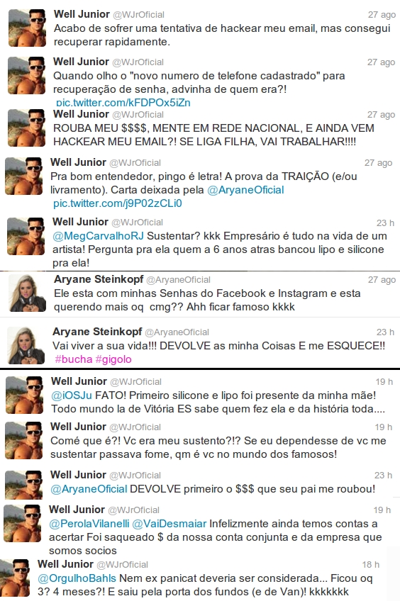 No twitter, os dois trocaram uma série de xingamentos, e Wellington fez várias revelações sobre a carreira, contando até que pagou as intervenções cirurgicas que levaram a loira a ter a aparência de hoje. Tudo começou com Wellington afirmando que seu email quase foi hackeado pela loira. Depois, ele mostra a carta que a moça fez para ele antes de entrar para o reality show. Depois, uma amiga ainda entrou na briga e contou que Aryane morava em uma favela e quem tinha dinheiro era Wellington. Confira o que eles dizem: