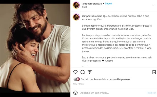 "Quem conhece minha história, sabe o que essa foto significa. Sempre repito o quão importante é, pra mim, preservar pessoas que tiveram grande importância na minha vida. Em tempos de possessão, controladorismo, machismo, relações tóxicas e até violência por não aceitação das mudanças da vida, tenho uma imensa honra e orgulho em postar essa foto e mostrar que a ressignificação das relações pode permitir que 4 pessoas iluminadas possam, hoje, se encontrar e celebrar a vida juntos. Isso é viver no amor e, particularmente, isso é manter meus pais vivos e presentes. Amém!", escreveu ele.