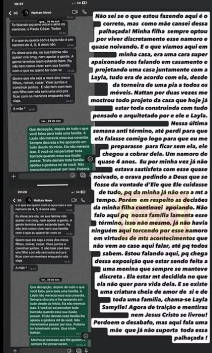 "O que víamos aqui em casa, era um cara super apaixonado nos falando em casamento e projetando uma casa juntamente com Layla, tudo era de acordo com ela. Desde a torneira de uma pia a todos os móveis. Nattan por duas vezes me mostrou todo o projeto da casa que hoje já é pensado e arquitetado pela ele e Layla. Nessa última semana, antes do término, até pedi para que ela falasse comigo logo, para que eu me preparasse para ficar sem ela, ele chegou a cobrar dela. Um namoro de quase quatro anos", disse.