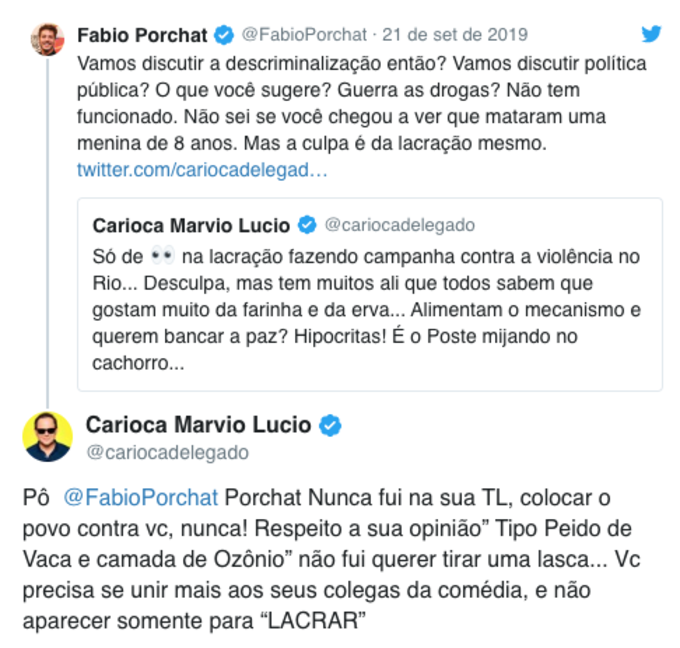 Porchat que foi um dos artistas que se manifestou sobre o assunto, respondeu: "Vamos discutir a descriminalização então? Vamos discutir política pública? O que você sugere? Guerra as drogas? Não tem funcionado. Não sei se você chegou a ver que mataram uma menina de 8 anos. Mas a culpa é da lacração mesmo”, finalizou.