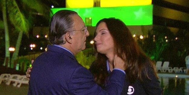 Por um breve momento na última quarta-feira, a Rede Globo se descuidou e deixou o satélite do seu sinal aberto ao vivo em Fortaleza, exibindo um momento em que Galvão Bueno e Patrícia Poeta se cumprimentam com um beijo, antes da transmissão, sem saber que estão sendo gravados.