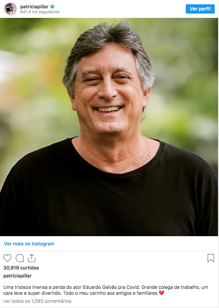 “Uma tristeza imensa a perda do ator Eduardo Galvão pra Covid. Grande colega de trabalho, um cara leve e super divertido. Todo o meu carinho aos amigos e familiares”, escreveu a atriz Patrícia Pillar.