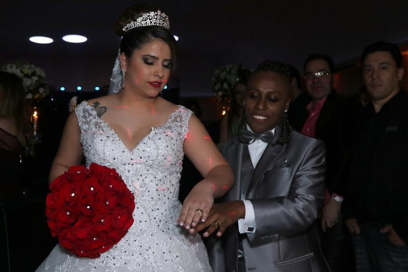 A cantora usou um smoking enquanto Thaís seguiu o tradicional vestido branco.