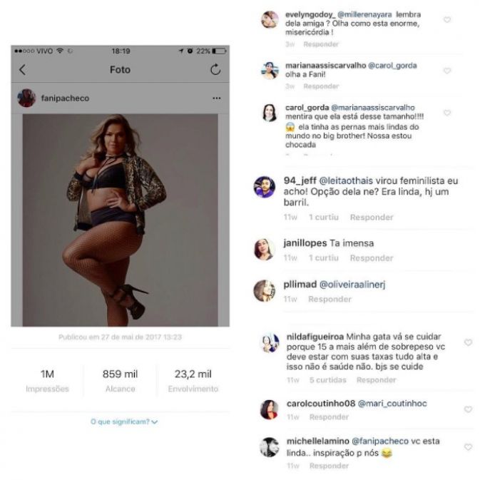 Fani Pachecho está se posicionando contra a gordofobia e além de gravar um novo vídeo para o seu canal, falando que após engordar se viu obrigada a recusar trabalhos que desvalorizavam sua imagem, a ex-BBB denunciou em seu Instagram alguns comentários degradantes sobre seu peso.
