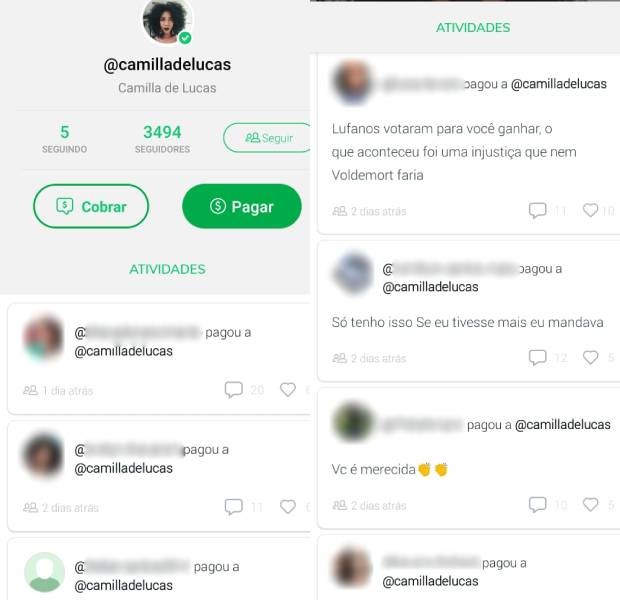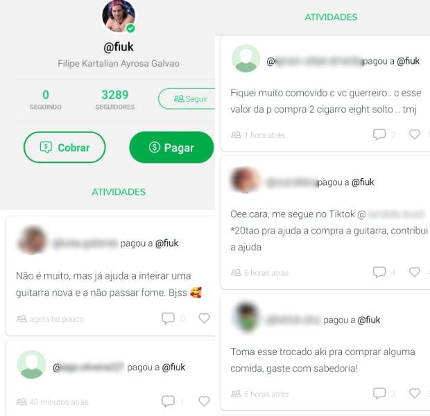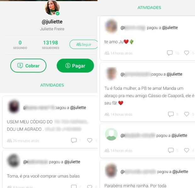 Os ex-brothers têm conta aberta no aplicativo PicPay, e é possível ver as doações que os fãs fazem, deixando recados e declarações para os famosos.