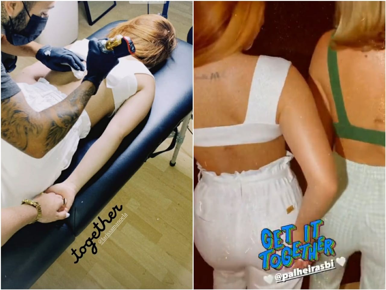 Na semana passada, elas fizeram uma tatuagem combinando, escrito “Together” [juntas, em inglês]. Enquanto Lari era tatuada, Bianca segurou a mão da atriz. "Agora essa fase incrível, cheia de descobertas, verdade, aventuras e autoconhecimento está eternizada. E que seja só o início de uma linda história que estamos vivendo. Estamos juntas, amiga", escreveu Bianca ao mostrar o momento.