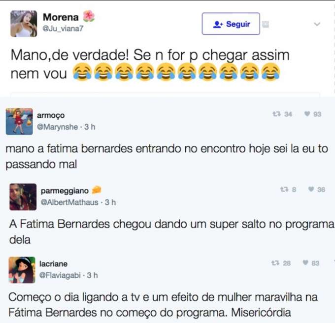 Com recurso de imagem, Fátima saiu do camarim para o estúdio em um pulo e divertiu os internautas. “Chegou chegando. Se não fosse para chegar causando eu nem saía de casa”, brincou um internauta. “E essa entrada da Fátima no ‘Encontro’?”, questionou outro.