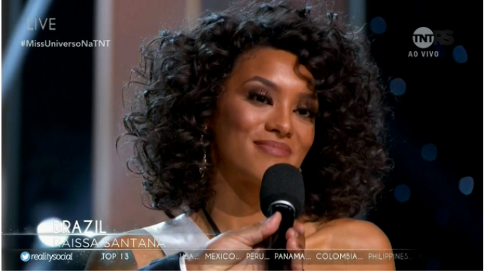 Raissa foi questionada pelo apresentador, Steve Harvey, sobre como é ser a primeira negra a representar o Brasil no Miss Universo em mais de 30 anos. E respondeu: "Estou orgulhosa de ser um exemplo para outras garotas como eu".
