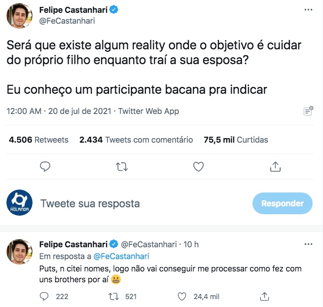 Castanhari ainda disse que não poderia ser processado, pois não citou nomes. “Puts, n citei nomes, logo não vai conseguir me processar como fez com uns brothers por aí “, disparou.