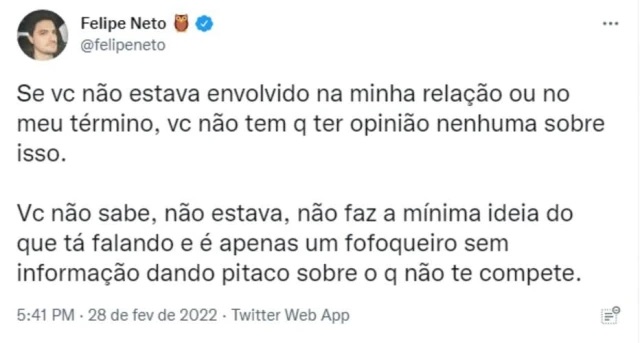 Após ver seu nome nos assuntos mais comentados, o youtuber desabafou nos stories e no Twitter: "Se você não estava envolvido na minha relação ou no meu término, você não tem que ter opinião nenhuma sobre isso".