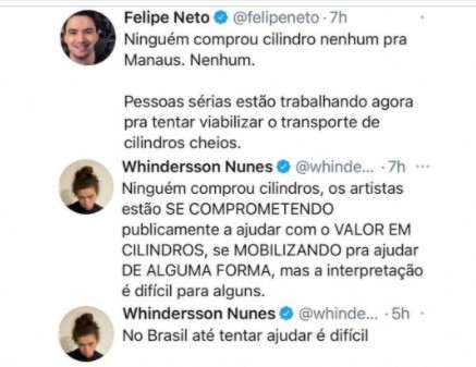 Whindersson Nunes começou uma corrente do bem e conseguiu inúmeras doações, Felipe Neto também se mobilizou e acabou fazendo um comentário que não agradou muito, ao dizer que "ninguém tinha comprado cilindro para Manaus".