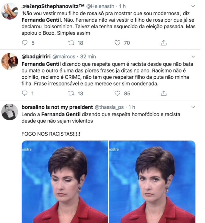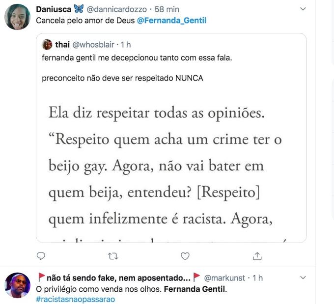 Fernanda Gentil levantou uma reação forte na internet após a entrevista que concedeu à Mônica Bergamo, na Folha de São Paulo, divulgada neste domingo (27). No Twitter, internautas a colocaram nos Trending Topics dizendo que iriam "cancelar" a apresentadora que fez declarações sobre temáticas LGBT, política, e disse que "respeita" quem é homofóbico e/ou racista.
