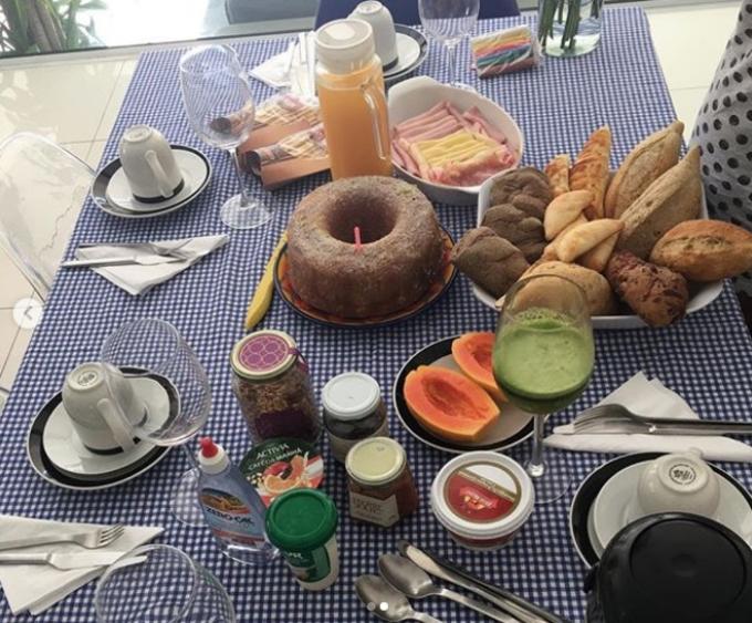 A jornalista mostrou a casa decorada e uma mesa de café da manhã preparada pela namorada, Patrícia Montandon.