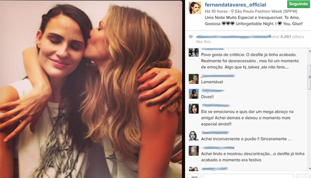 Amigas declaradas, Gisele Bündchen e Fernanda Tavares sempre demonstraram o carinho que têm uma pela outra em público. Mas um momento entre as duas no São Paulo Fashion Week chamou atenção dos fãs e gerou muitos comentários nas redes sociais, alguns deles negativos. Durante o desfile de despedida de Gisele, Fernanda deu uma 'chacoalhada' na übermodel.