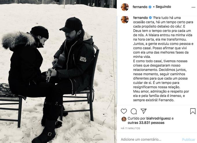 Após uma série de términos e reconciliações, Fernando tomou uma atitude inédita neste sábado (18), anunciando o fim do relacionamento com Maiara com um textão.