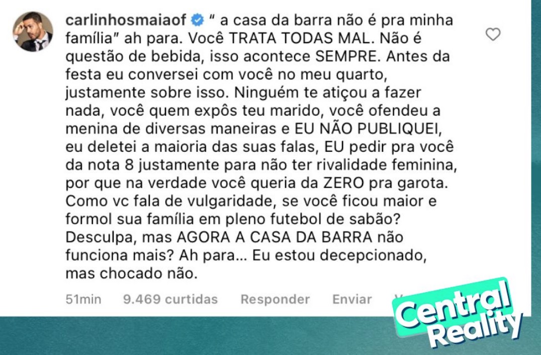 Carlinhos rebateu através de um comentário na página Subcelebrities. “Ah, para. Você trata todas mal. Não é questão de bebida, isso acontece sempre. Antes da festa eu conversei com você no meu quarto, justamente sobre isso. Ninguém te atiçou a fazer nada, você quem expôs seu marido, você ofendeu a menina de diversas maneiras e eu não publiquei, eu deletei a maioria das suas falas, eu pedi pra você dar nota 8 justamente para não ter rivalidade feminina, porque na verdade você queria dar 0 pra garota”, expôs.
