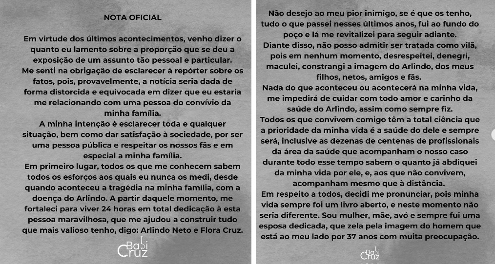 Flora Cruz, filha de Arlindo Cruz, manifestou apoio a Babi Cruz em meio à crise em família devido ao novo relacionamento assumido pela mãe, mesmo ainda estando casada com o sambista, que sofre com as sequelas de um AVC desde 2017..