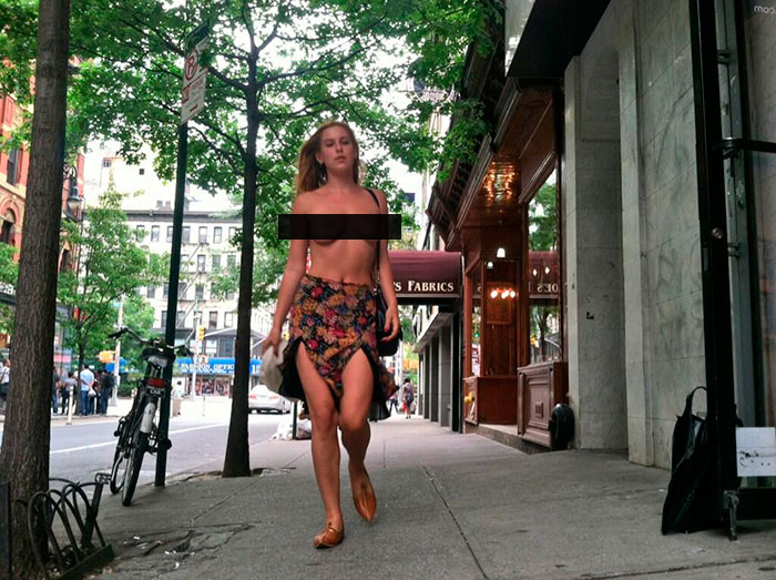 A jovem resolveu sair mostrando os seios pelas ruas de Nova York. Ela postou duas fotos de topless no Twitter com a hastag #freethenipple (liberte os mamilos) e na legenda: "Legal em Nova York, mas não no Instagram".