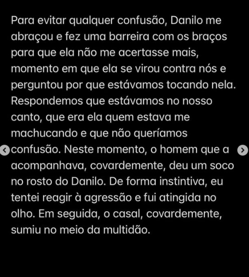 “A mulher que aparece no vídeo gritando com o Danilo, é importante dizer, nada tinha a ver com a agressão sofrida minutos antes, mas esbravejou que nós dois estávamos causando uma confusão no show”, escreveu.