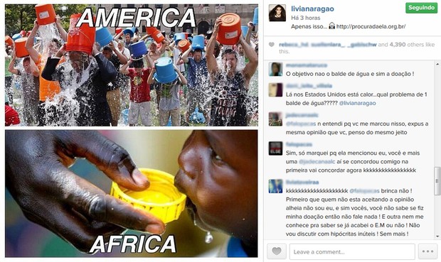 Lívia Aragão, filha de Renato Aragão, causou polêmica ao criticar o "desafio do gelo". Ela fez uma montagem em que simbolizava a América com várias pessoas fazendo o desafio e na outra imagem simbolizava a África com uma criança negra recebendo água em uma tampa. "Apenas isso", escreveu na legenda.