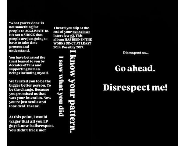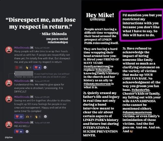 "Ei, Mike. As pessoas não estão com dificuldade para aceitar a perspectiva de que o Linkin Park se reinvente. Elas têm dificuldade para aceitar que você: 1) Contratou sua amiga de muitos anos Emily Amstrong para substituir Chester Bennington sabendo da história de Emily com a Igreja e de sua história como uma aliada de Danny Masterson.