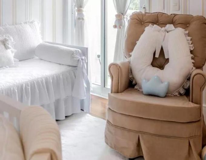 Os ursinhos de pelúcia complementam a proposta clássica do ambiente, que também ganhou almofadas em formato de coroa. O enxoval é todo feito de tricô, com muitos laços e babados que remetem a delicadeza.