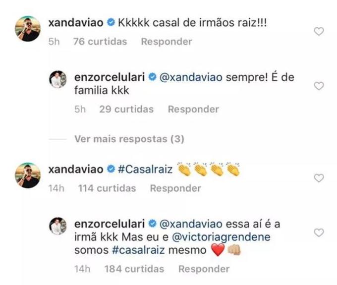 O filho de Claudia Raia então avisou: “Xand, essa aí é minha irmã (risos), mas eu e a Victória Grendene somos casal raiz mesmo”.