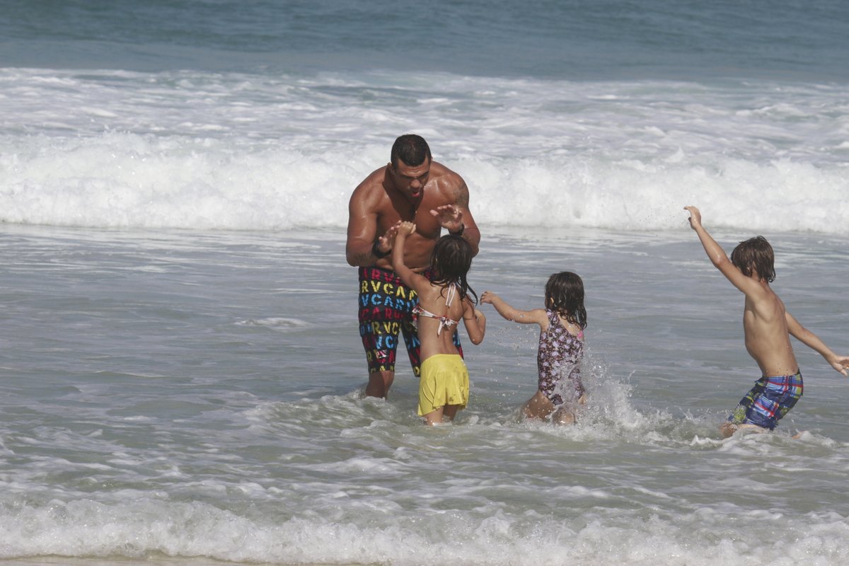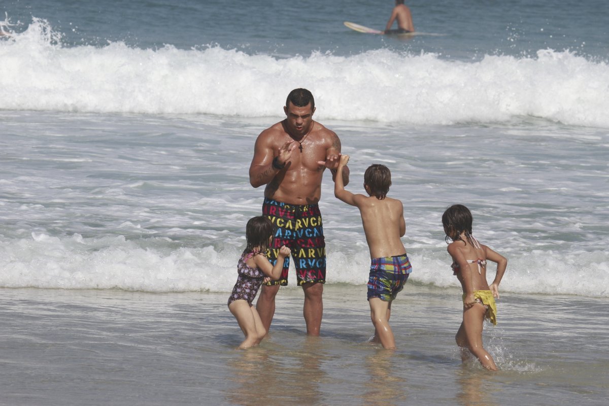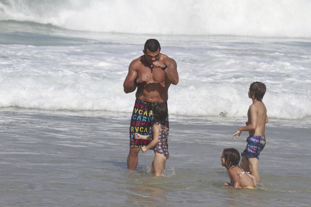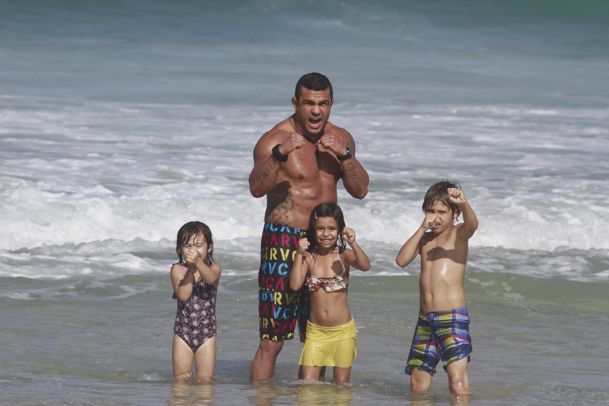 Os filhos de Vitor Belfort mostraram que 'filho de peixe, peixinho é' e imitaram a pose de combate do pai, durante o passeio pela Praia da Barra da Tijuca, no Rio de Janeiro, que o lutador realizou nesta terça-feira (11) com as crianças, Victoria, Davi e Kyara, frutos do seu casamento com Joana Prado.