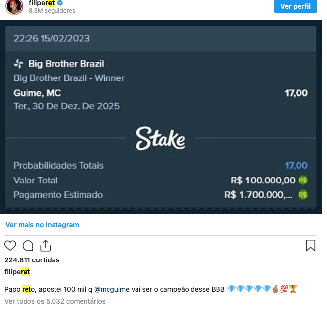 No Instagram, na noite da última quarta-feira, 15, Ret declarou: “Papo reto, apostei [R$] 100 mil que o Guimê vai ser o campeão desse BBB”. Para confirmar, ele divulgou o comprovante da aposta feita.
