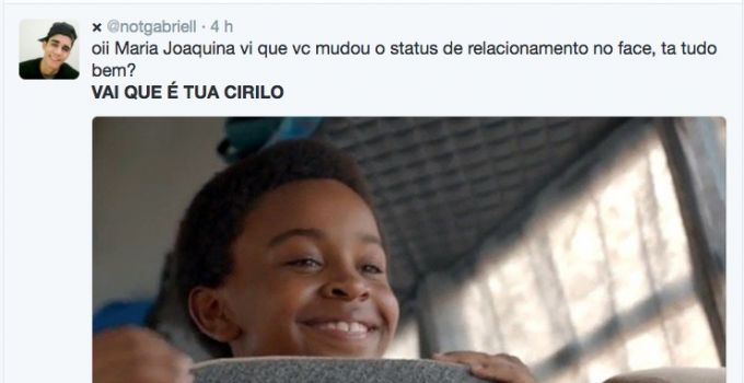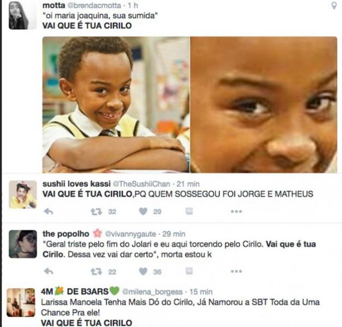 A hashtag “Vai que é tua Cirilo” é um dos assuntos mais comentados do Twitter, que faz referência a novela “Carrossel” onde Larissa interpretava Maria Joaquina grande amor do personagem Cirilo.