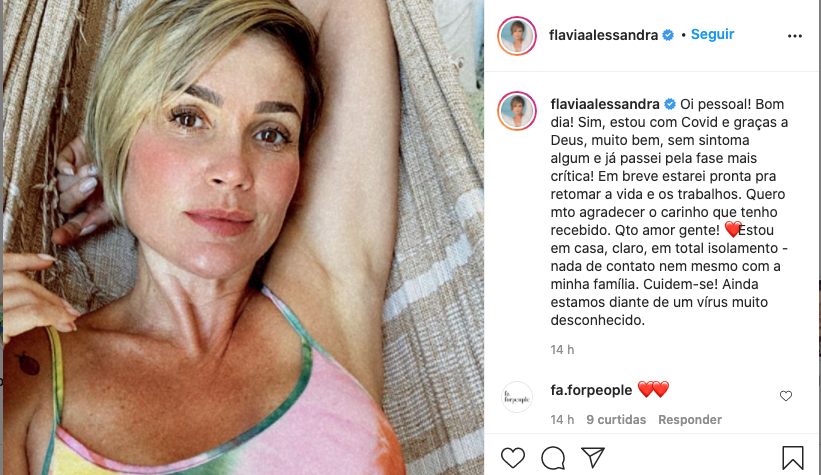Flávia aproveitou para agradecer o apoio dos fãs. "Quero muito agradecer o carinho que tenho recebido. Quanto amor gente! Estou em casa, claro, em total isolamento - nada de contato nem mesmo com a minha família. Cuidem-se! Ainda estamos diante de um vírus muito desconhecido.", alertou.
