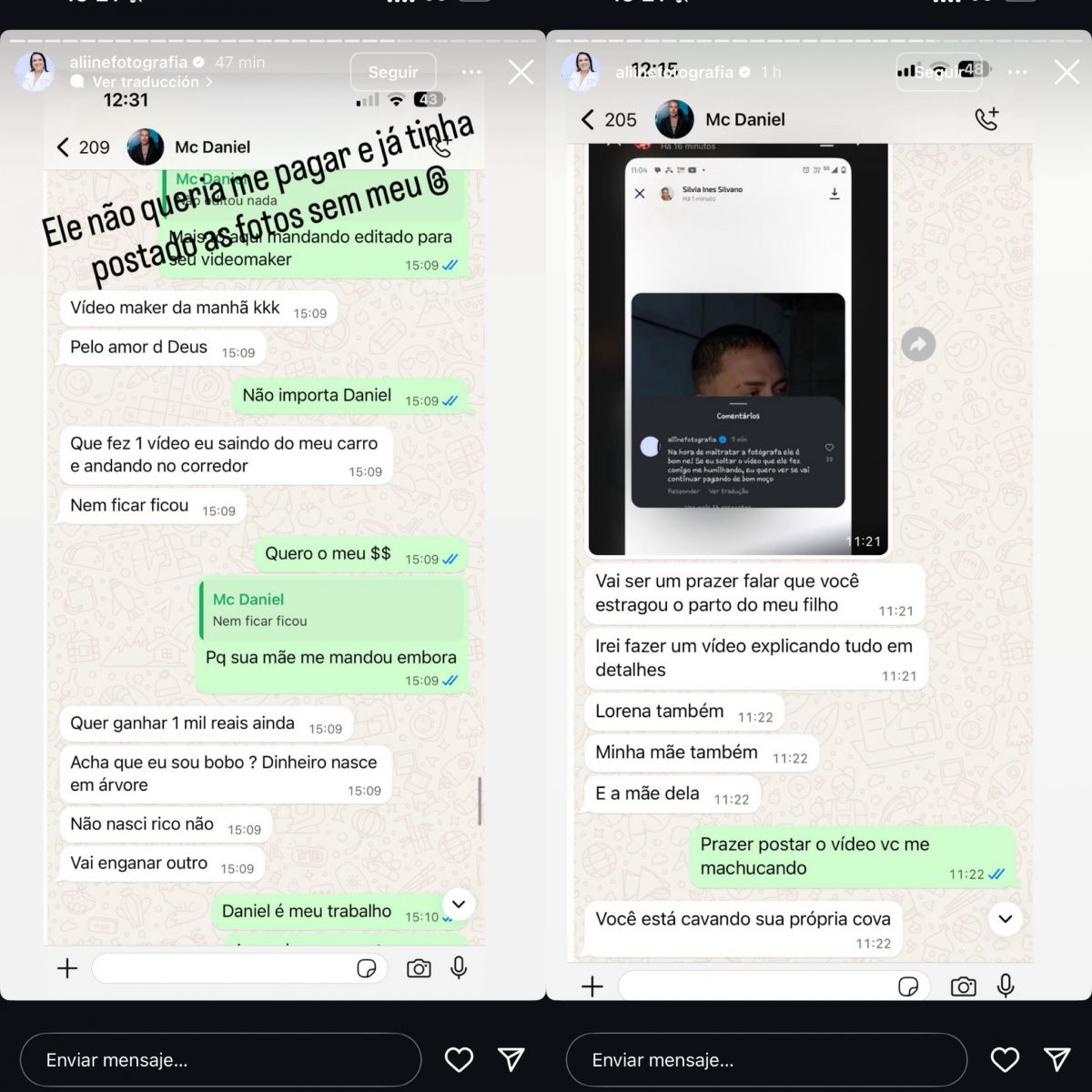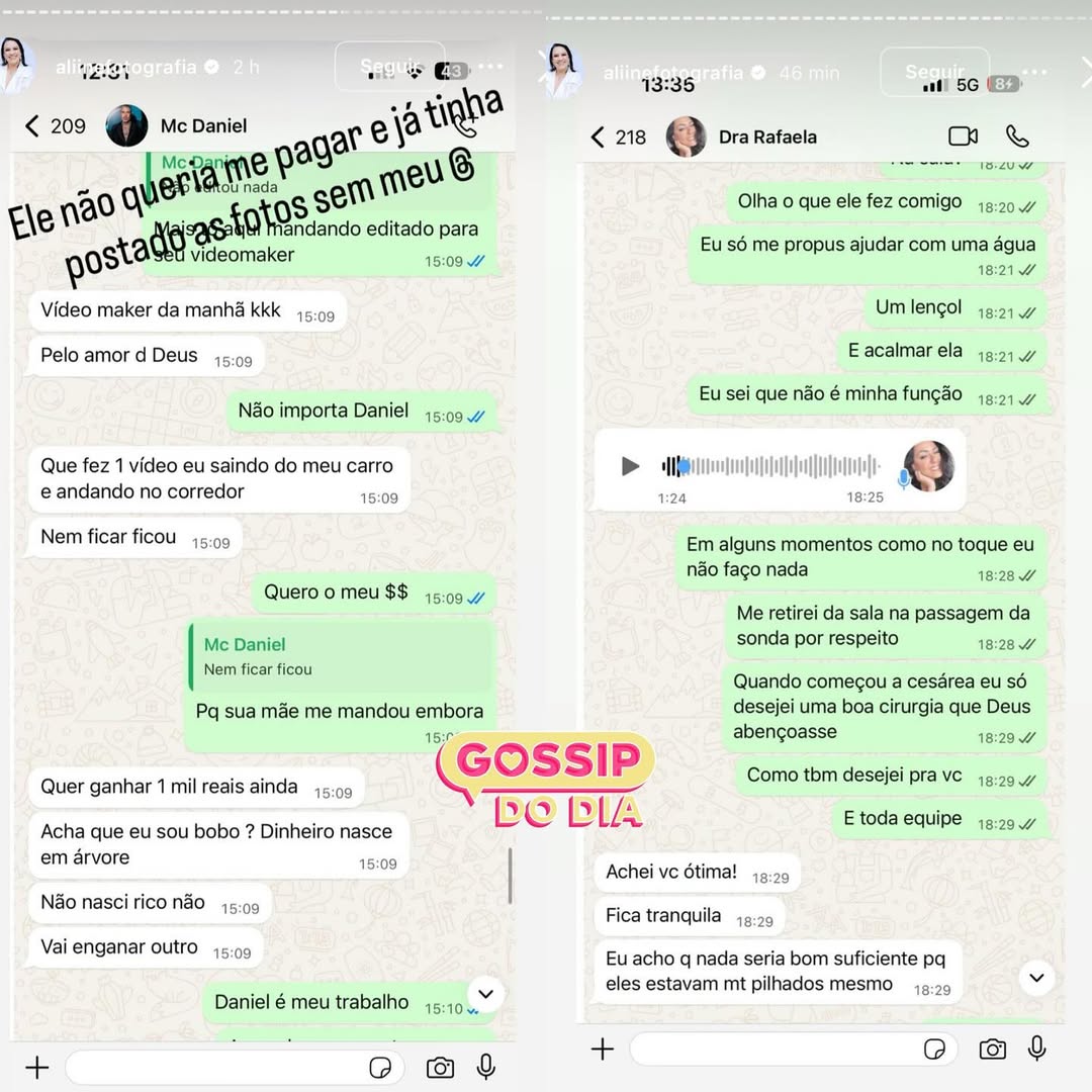 Após acusar MC Daniel de agressão durante o parto do filho com Lorena Maria, a fotógrafa Aline Morais decidiu divulgar prints de conversas para reforçar sua versão, além de um print de um vídeo que segundo ela, comprovaria a sua afirmação de que ele teria a puxado pelo braço.