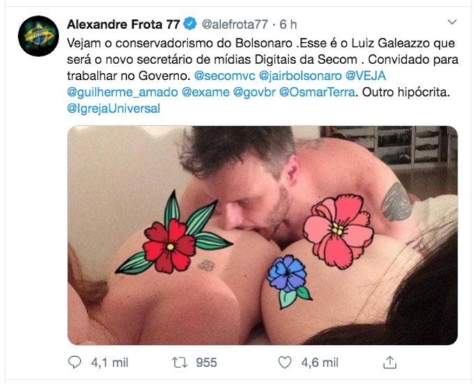 BRASÍLIA, DF (FOLHAPRESS) - O deputado Alexandre Frota (PSDB-SP) publicou em suas redes sociais uma foto íntima de Luiz Galeazzo, o publicitário bolsonarista cotado para assumir o comando da Diretoria de Conteúdo e Gestão de Canais Digitais na Secom (Secretaria de Comunicação da Presidência).