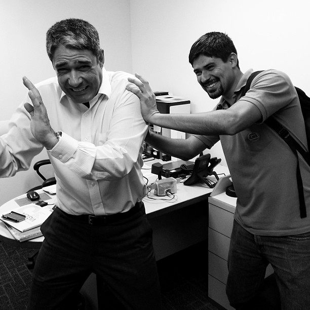 No Instagram, ele aparece com Adriano Oliveira e dessa vez recebe um empurrão de 'vingança' do funcionário. Para fazer graça da situação, o âncora do Jornal Nacional escreveu na legenda da imagem: "Rio, 26 de julho. Antes que pudesse balbuciar um pedido patético de desculpas, o âncora é violentamente atirado contra a parede pelo auxiliar. E Adriano Oliveira está finalmente vingado."