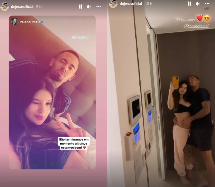 No entanto, após a repercussão da atitude do jogador, o casal negou os boatos e afirmou que está junto. "Meu amor", escreveu ele, postando uma foto ao lado da namorada exibindo a barriga. "Não terminamos em nenhum momento, estamos bem", escreveu ela.