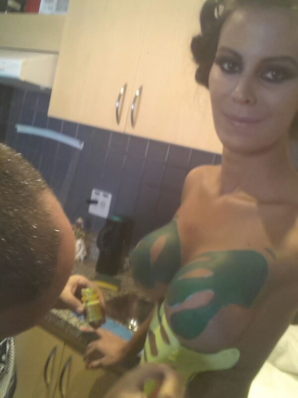 Lorena Bueri não tem medo de nudez, e, apenas coberta pela pintura corporal realizada pelo artista plástico Binho Ribeiro, a gata do Paulistão 2012 posará na Grande São Paulo, em frente ao estádio do Pacaembú.