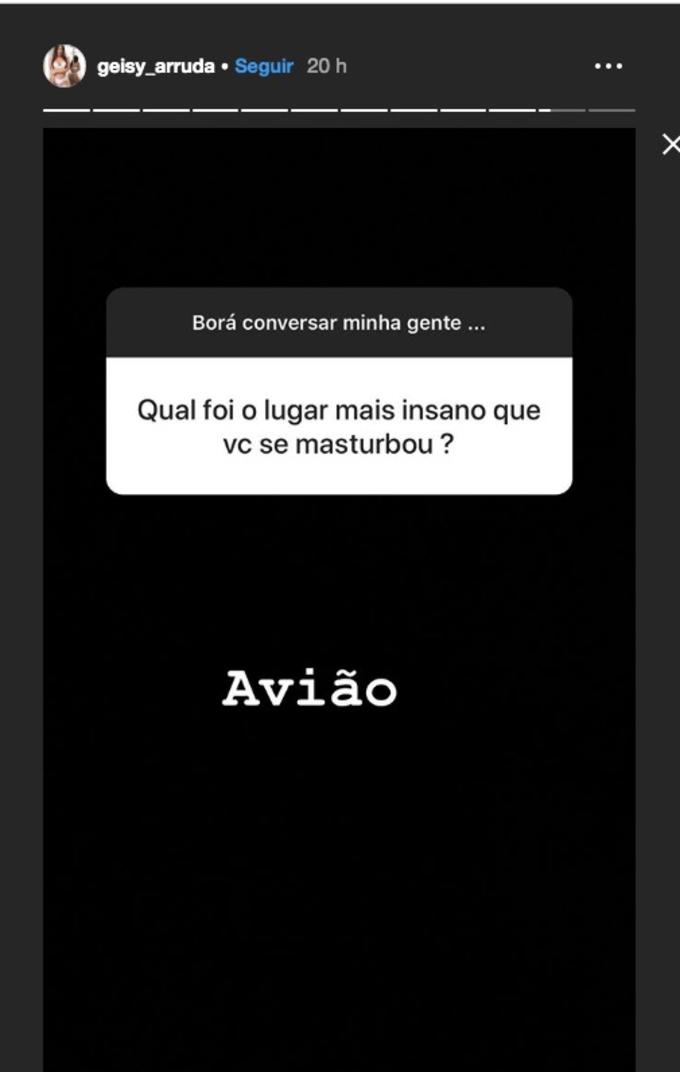 Além de falar sobre menagem, e sexo anal, Geisy conta experiências sexuais que já teve. Na noite de sábado (7), ela respondeu a curiosidade de um seguidor, que perguntou qual o lugar ‘mais insano’ onde ela teria se masturbado. Sem cerimônia, ela respondeu: ‘Avião’; Veja: