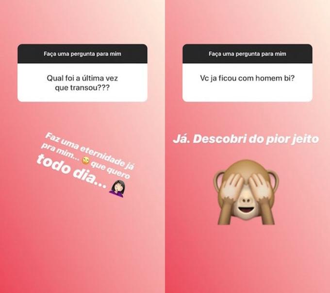A modelo voltou a falar sobre o assunto em outro Storie: "Qual é a coisa que mais te irrita? E qual te deixa um amor?", perguntou um seguidor.