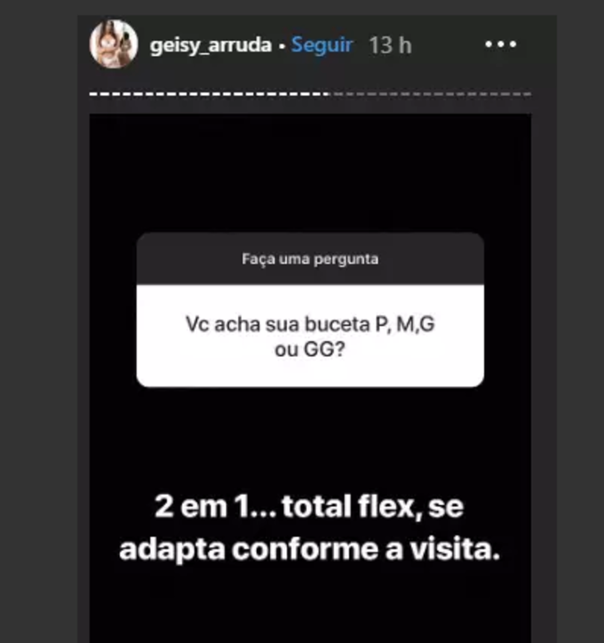 Ousada, Geisy rebateu: “2 em 1… Total flex, se adapta conforme a visita”.